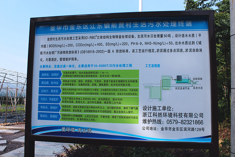 金華市江東鎮(zhèn)前賈村生活污水處理工藝采用3D-RBC立體結(jié)構(gòu)生物轉(zhuǎn)盤(pán)處理設(shè)備,生活污水日處理量50噸,